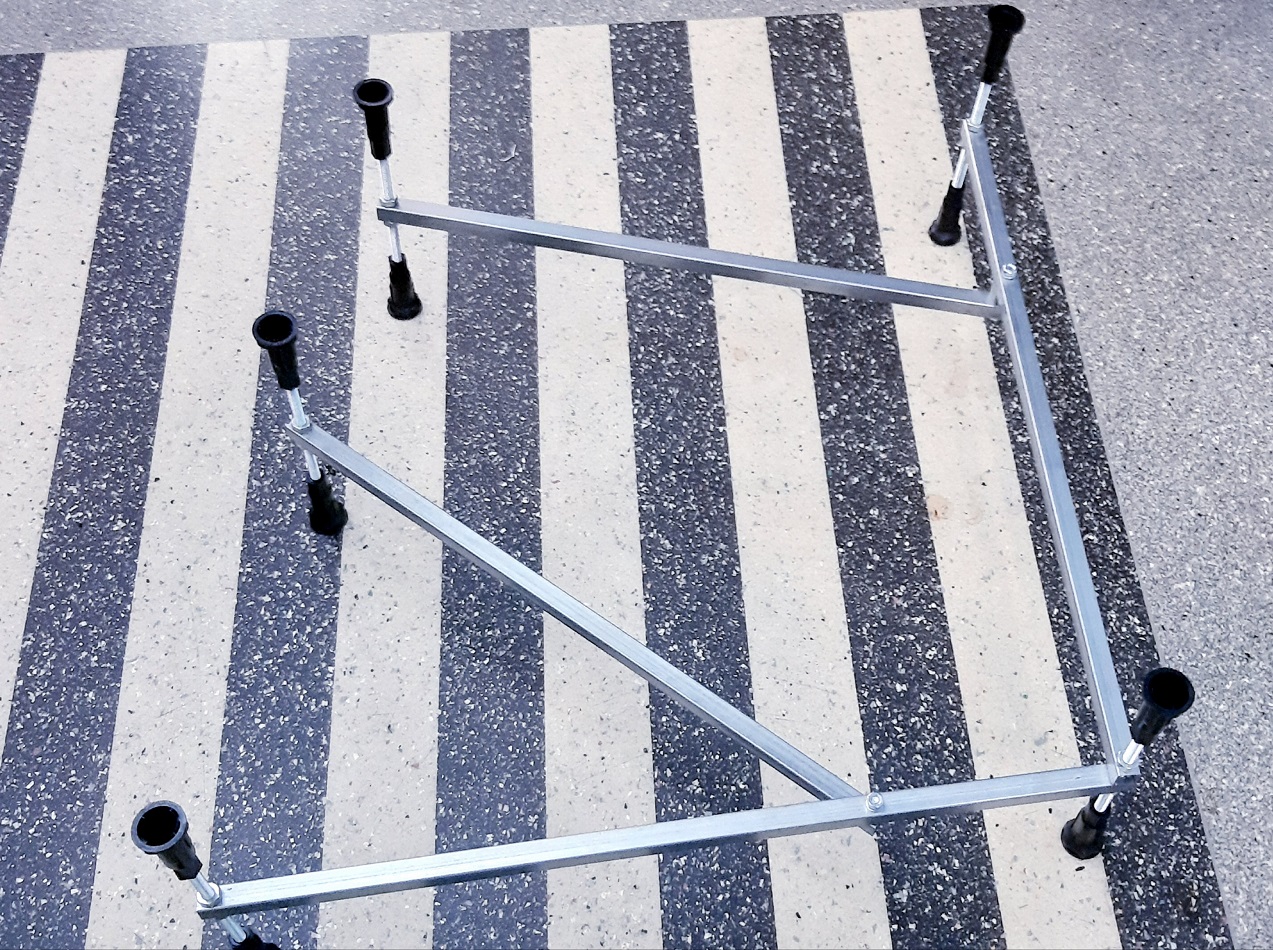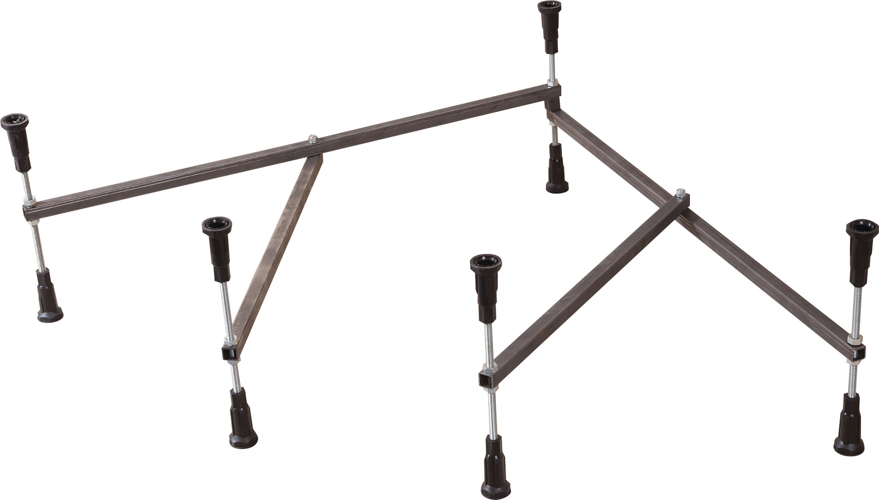 Конструкция каркаса выполнена из оцинкованной трубы квадратного сечения 20мм с размерами равными размерам душевого поддона. 5-ть шпилек с резьбой М10/М12 длиной 250мм оснащены пластиковыми опор-ножками с резьбой для удобной регулировки, а также болтами и гайками для жесткой фиксации конструкции. Каркас для поддона стальные трубы образуют лучи с размерами поддона, придавая устойчивость душевому поддону на неровной поверхности.
