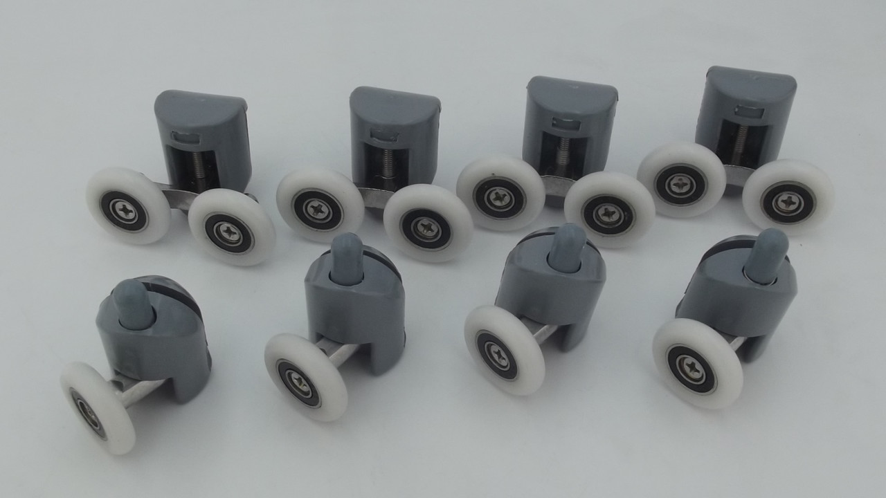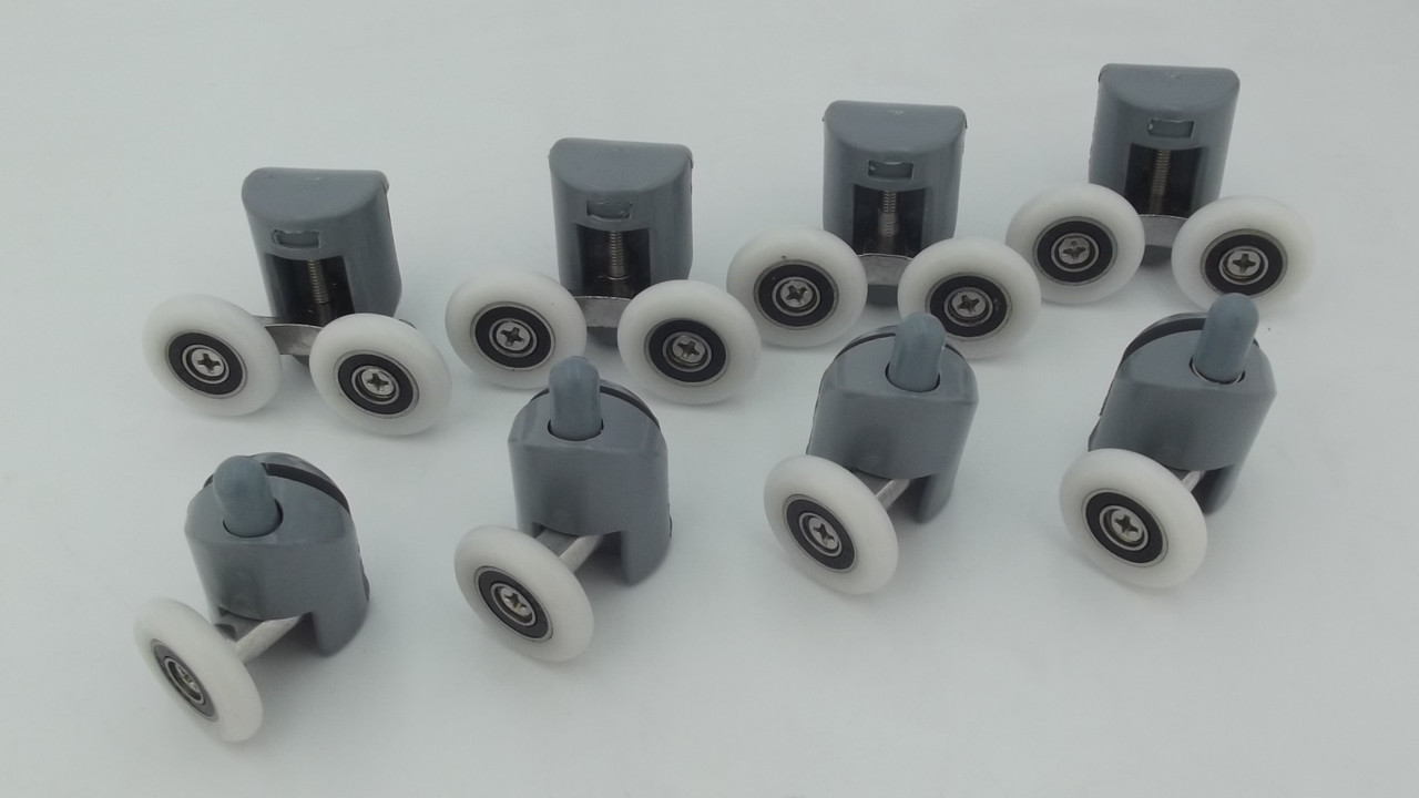 Универсальный комплект роликов для душевых кабин из 8шт в комплект входит 4 верхних ролика 4 нижних ролика. Верхние ролики двойные с регулировочным болтом нижние с нажимной кнопкой.